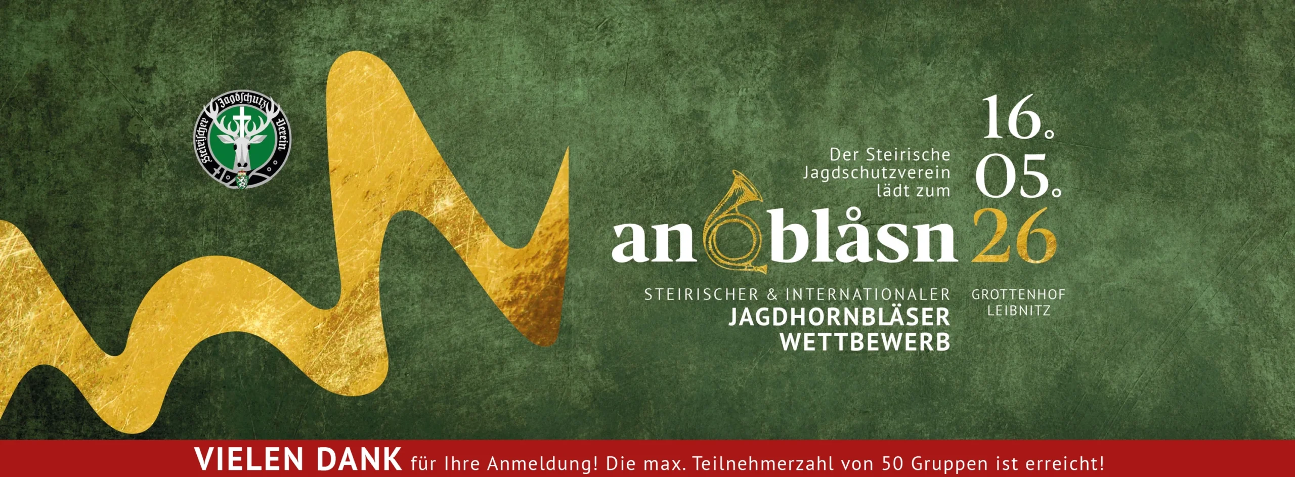 Der steirische Jagdschutzverein veranstaltet am 16. Mai 2026 den 19. Steirischen Jagdhornbläser-Wettbewerb und den internationalen Jagdhornbläser-Wettbewerb anblåsn26 im Kultur- und Eventzentrum Grottenhof in Leibnitz.